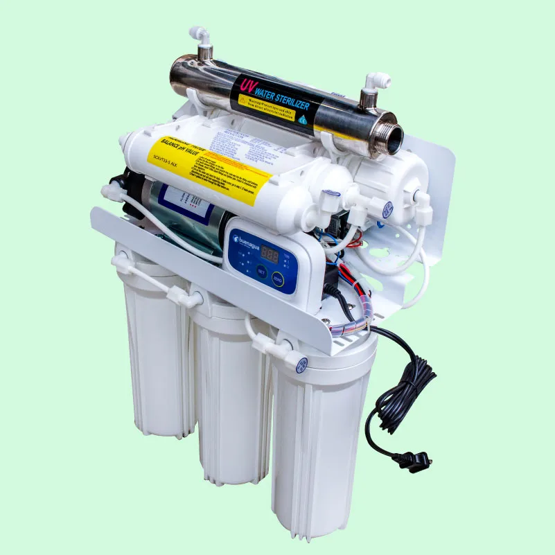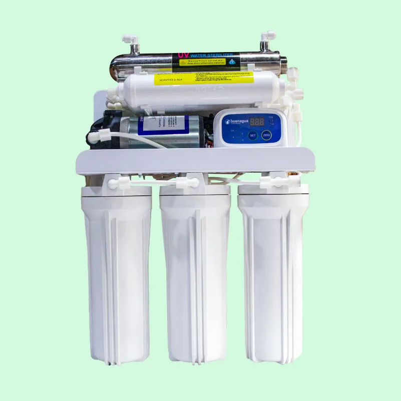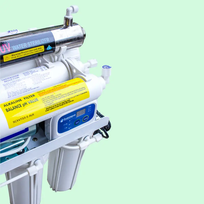El sistema Platino cuenta con 7 etapas de purificación que funcionan con una filtración de agua por ósmosis inversa de alta capacidad. Se instala de forma fácil y rápida debajo del fregadero, haciendo que el agua sea apta para lavar alimentos y limpiar utensilios de cocina. Además, tiene facilidad de conexión a refrigeradores y otros aparatos (máquinas de café, hielo etc.)